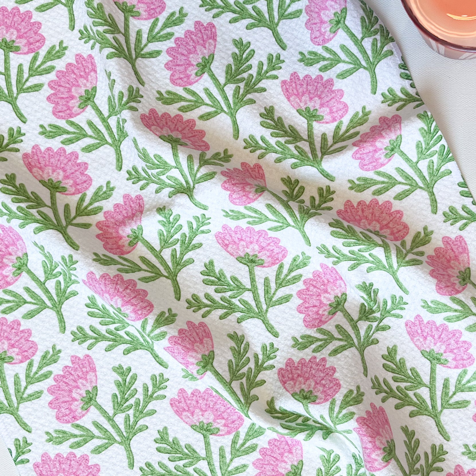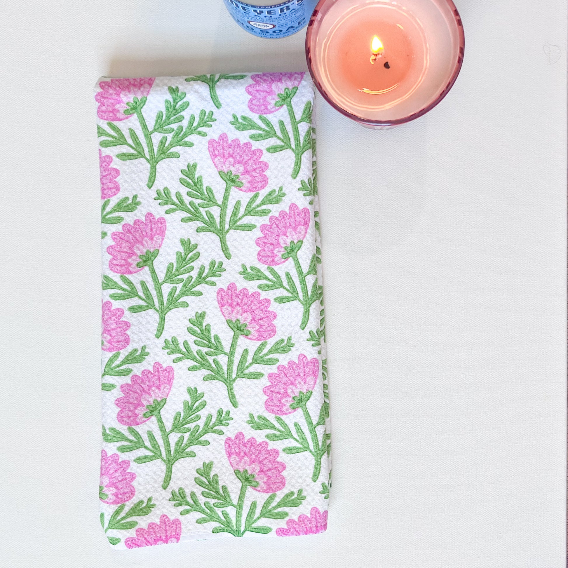 Brighten up your space with our Pop of Pinks Hand Towel, featuring a charming repeat pattern of pink flowers that come together to create a subtle diamond design. This towel is perfect for anyone who loves a touch of floral elegance with a pop of color.
